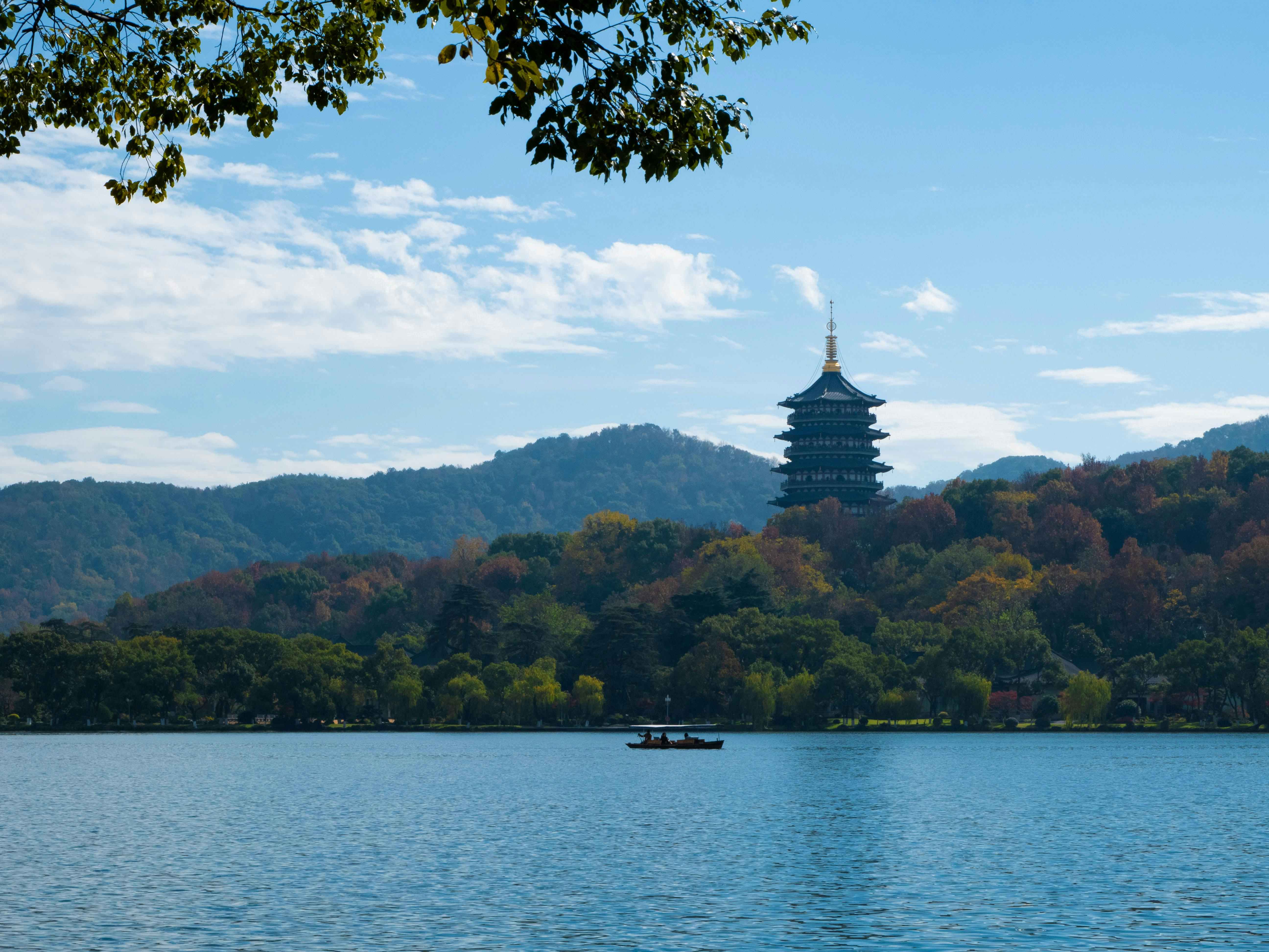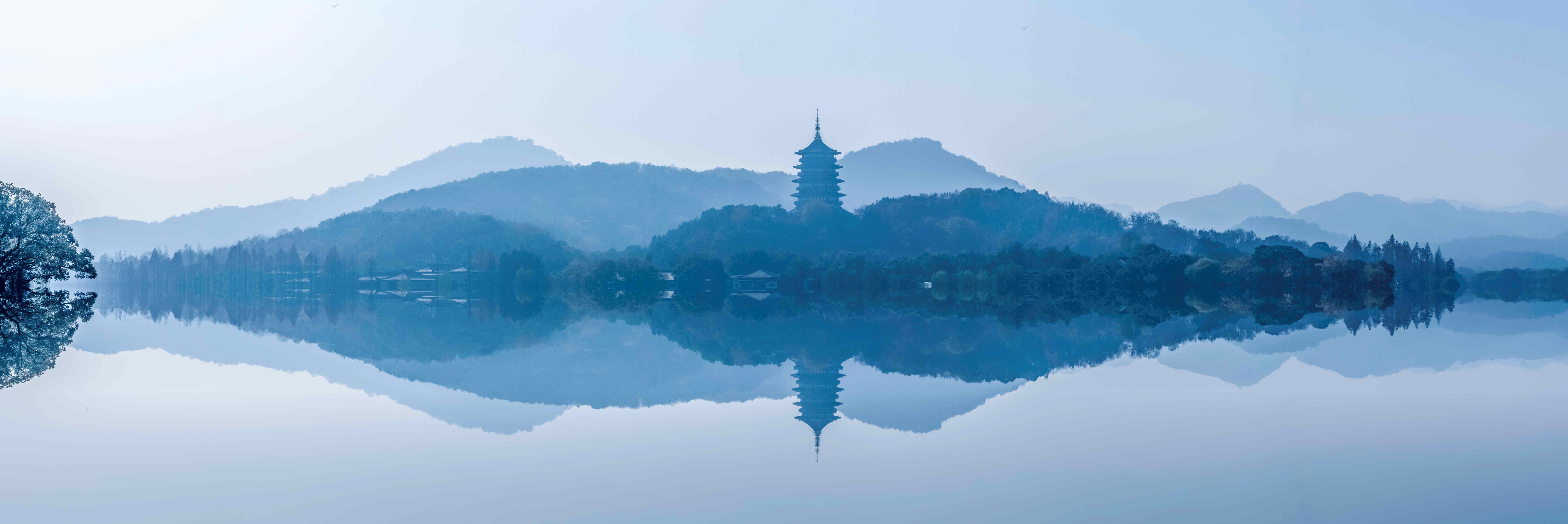 青山环绕,西湖如镜,如山水相依的美丽画卷。