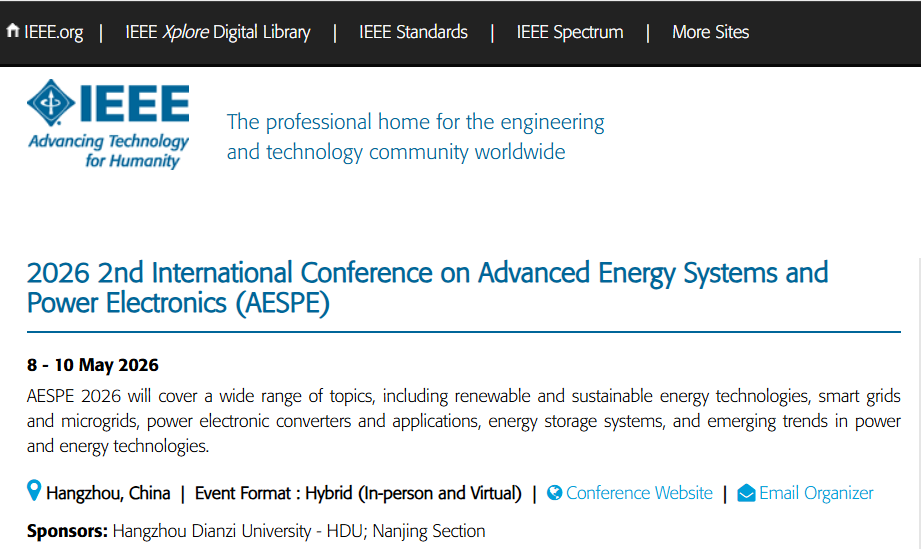 第二届先进能源系统与电力电子国际学术会议(AESPE 2026)是一个专注于探讨先进能源系统和电力电子技术领域最新研究成果与创新发展的国际性学术会议,将于2026年5月8-10日在中国杭州举办。该会议将延续第一届特色,汇聚国内外顶尖学者和业界精英,围绕能源系统优化、电力电子技术创新等关键议题进行深入交流与探讨,旨在促进新技术、新方法、新应用的诞生与推广,为全球能源转型和可持续发展贡献力量。