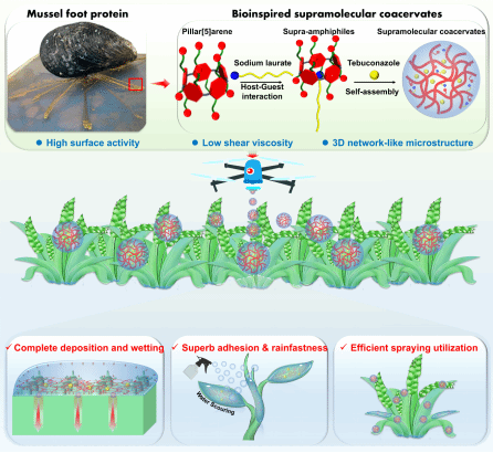 图1. 仿生超分子凝聚体增强农药在小麦叶面高效对靶递送行为示意图。