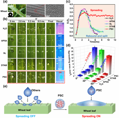 图2. (a) 超疏水小麦叶面微纳米结构的SEM图像。(b) 超分子凝聚体液滴在小麦叶面的高速动态撞击行为。(c) 超分子凝聚体液滴在小麦叶面的动态撞击归一化扩散直径Dt/D0变化。(d) 超分子凝聚体液滴高速撞击在不同倾斜角度小麦叶面的铺展面积。(e) 超分子凝聚体在小麦叶面高速撞击铺展沉积示意图。